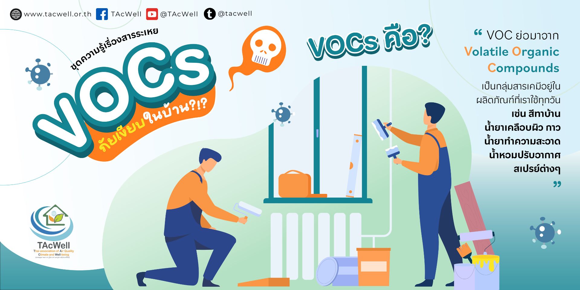 VOC ย่อมาจาก Volatile Organic Compounds คือกลุ่มสารเคมีที่ระเหยสู่อากาศได้ง่าย พบในผลิตภัณฑ์ที่เราใช้ทุกวัน เช่น สีทาบ้าน น้ำยาเคลือบผิว กาว น้ำยาทำความสะอาด น้ำหอมปรับอากาศ และสเปรย์ต่าง ๆ