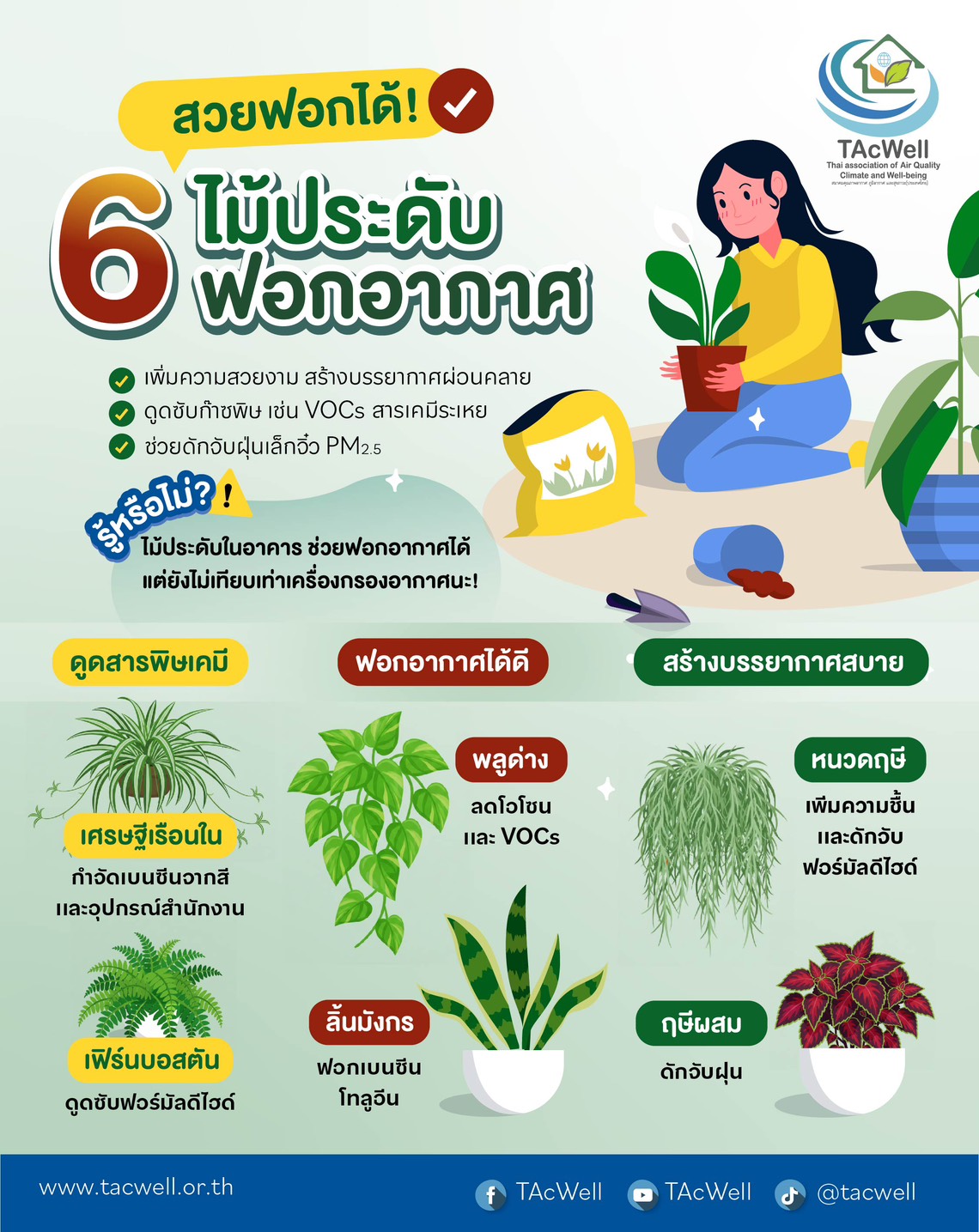 ไม่เพียงเพิ่มความสวยงามและสร้างบรรยากาศผ่อนคลายในบ้านหรือที่ทำงาน แต่ไม้ประดับบางชนิดยังมีคุณสมบัติช่วย ดูดซับสารพิษ เช่น VOCs และสารเคมีระเหย ช่วยดักจับฝุ่นละอองขนาดเล็ก (PM2.5) เพิ่มความชื้น และสร้างความสดชื่นให้กับอากาศรอบตัว